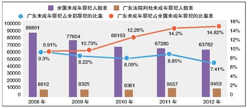 2008年至2012年,广东省三级法院共判处未成年罪犯44508人,整体人数在高位徘徊。2011年和2012年未成年罪犯人数均超过了9000人。而同期全国法院判处未成年罪犯总数逐年减少,由2008年的88891人下降为2012年的63782人。