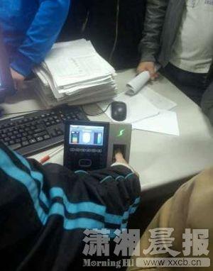 湖南人文科技学院物理系2011级同学按指纹签到。图/网友提供