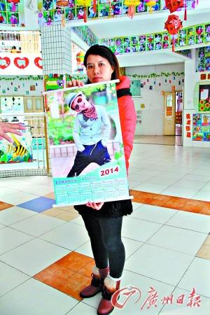 幼儿园工作人员展示摄影机构拍摄的免费挂历,其背后是“微笑墙”。