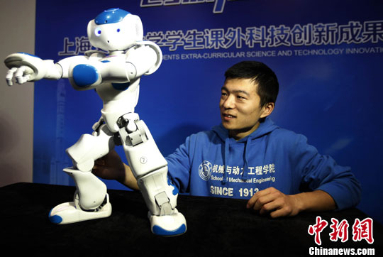 12月12日,在上海交通大学学生课外科技创新成果展上,学生与跳舞机器人展开对话,引人关注。中新社发 汤彦俊 摄