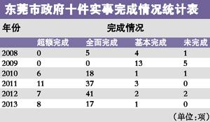 到2013年,十件实事完成情况再一次创下好成绩,基本圆满完成。十件实事共26项工作中,8项工作超额完成,占30.8%;17项工作全面完成,占65.4%;1项基本完成,占3.8%;是东莞市2002年实施市政府十件实事以来,完成情况最好的一年。
