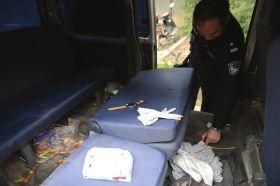 1月6日,益阳桃江灰山港派出所,绑匪车内还散落着零食以及人质的一块手表。图/记者陈勇