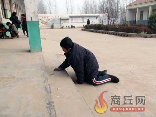 夏邑县业庙乡李寨小学里有名特殊的学生,因为双腿自膝盖以下没有知觉,他只能爬行。因为小便失禁,读三年级的他也只能穿着开裆裤上学。但即使如此,他还是奋发学习,始终没有放弃对知识的渴望。