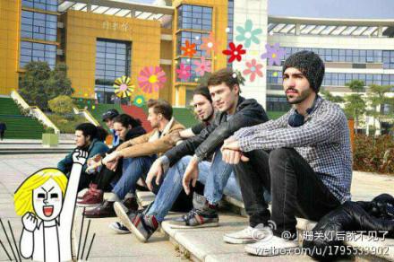 “@小珊关灯后就不见了”在微博里晒了两张照片,一张背景是外经贸学院的图书馆,一位身穿皮夹克的外国小伙面带微笑,左手握着一只白鸽,右手正在给它喂食;另一张照片里,七八个外国帅哥坐在图书馆广场上,用网友的话说,“酷毙了,往那一坐,就像在拍时尚海报!”