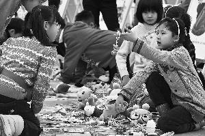 走进崇文少年宫四层体育馆,里面好不热闹,吆喝声、讨价声不绝于耳。“看看吧,先到先得,不容错过哟……”前门小学四年级学生路芮沣眨着大眼睛热情地招呼生意。“9点多刚来时可不这样,坐在地上半天不知说什么好,别人问价都不好意思回答。”他的妈妈任莉萍在一旁悄悄“揭老底儿”,“这不,半天儿下来,看到别的孩子都在推销自己的东西,他也学会了,卖了50多块钱了!”