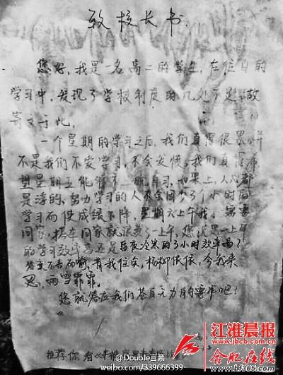 1月8日,在桐城中学的布告栏上,一封自称是高二学生所写的名为《致校长书》的信,被贴在上面。信中称,自己是一名高二学生,在往日的学习中,发现了学校制度的一些不足之处。信中说,在经过一周的学习后,学生们都很疲倦,而周五晚上仍要上晚自习,收不到学习效果。信中还举例,假如周五上晚自习的话,周六回家就有半天时间花在回家的路上。因此,还不如让学生周五晚上回家,周六自己在家学习。