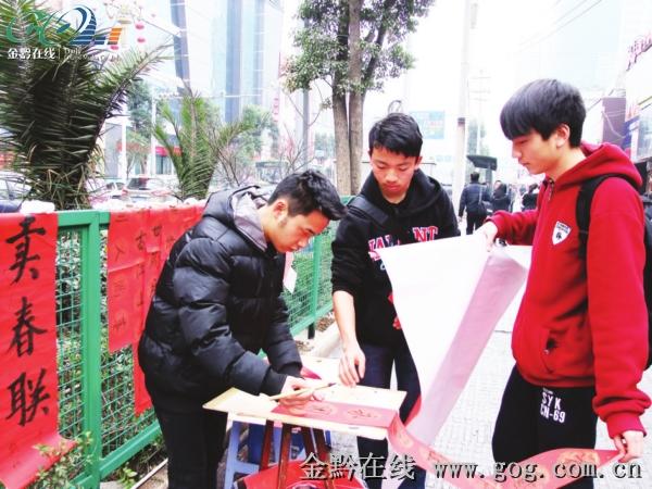 昨日,记者路过安顺西秀区小十字时,看见3名青年背着书包正在人行道上卖春联。据了解,他们分别是来自安顺民中的高三年级学生张某、陈某和赵某,上街写春联卖,只是为了锻炼自己和赚点过年费。