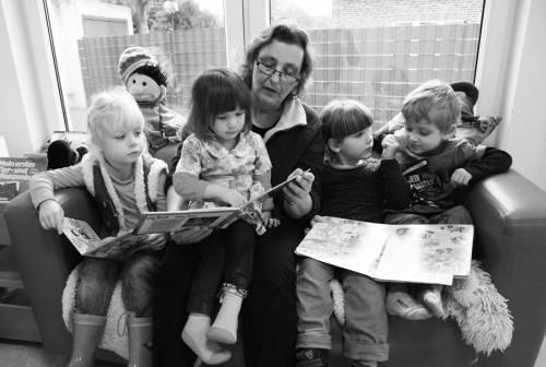 德国杜塞尔多夫一所幼儿园里,老师与孩子一起阅读。