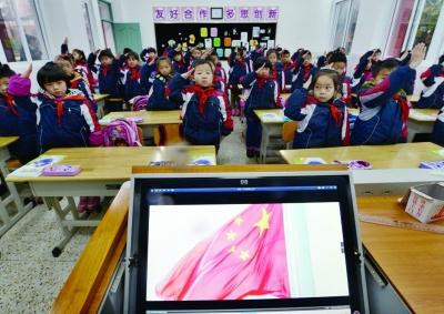 南京双塘小学在上“开学第一课”,图为孩子们在向屏幕上的国旗敬礼。 扬子晚报记者 宋峤 摄