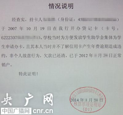 发放信用卡的中国工商银行玉林分行,也承认学生们对于信用卡的使用规则不知情。在该行向一位涉事同学出具的情况说明中,有这样的表述:“学校当时为方便发放学生助学金,集体为学生申请办卡,且其本人当时并不了解信用卡产生年费逾期造成违约,非个人故意行为。”