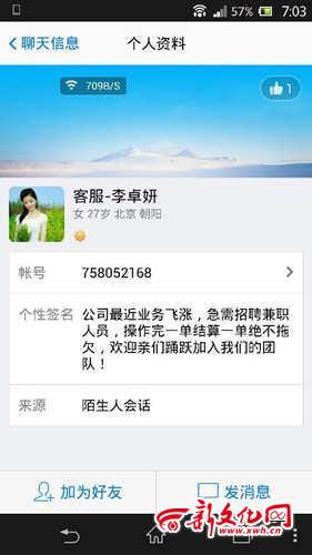 小杨是大一新生,平时喜欢网购。4月初,她在淘宝一家店铺,购买了一个手机壳。事后,她加了店主的微信。每天店主都会在微信里,发布一些消息。15日上午,小杨看到店铺发布了招聘信息。招聘的内容,就是兼职,日赚200元,时间地点不限。对这样的一份工作,小杨颇为动心,还加了信息里留下的QQ号码。