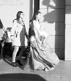 美女穿汉服逛街 原来是高校学生为演出练胆