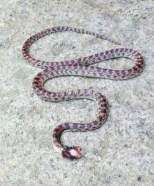 昨日下午4时许,记者赶到苍霞幼儿园门口,见到一条蛇蜷缩在地,蛇头已被踩烂。它身长四五十厘米,通体背面都是红黑相间的花纹,腹部为白色。一名四五岁的女孩拿着树枝捅死蛇玩,一点都不害怕。