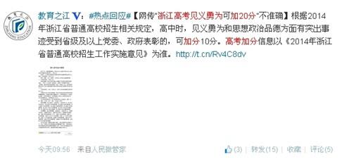 今日上午,浙江省教育厅官方微博“教育之江”对“浙江高考见义勇为和思想政治品德突出的可加20分”的传言回应称,根据2014年浙江省普通高校招生相关规定,高中时,见义勇为和思想政治品德方面有突出事迹受到省级及以上党委、政府表彰的,可加分10分。高考加分信息以《2014年浙江省普通高校招生工作实施意见》为准。