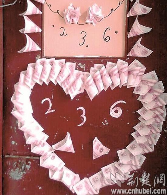 把近50张面值100元的点钞券卷成花朵状,粘在一起,组成心形和寝室号,一个用“钞票”装扮的土豪寝室大门就此诞生了。严凤芝说,室友们看着这门,都觉得自己瞬间高大上了,赶紧拍照发微博。