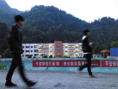 5月27日傍晚,贵州省印江自治县杨柳中学里的灯光逐渐亮起。暮色中,学校围墙上悬挂的红底白字条幅格外显眼。