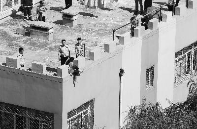 事发地点位于天通苑西一区的北京春天双语幼儿园内,记者今天上午9时在现场看到,一名身穿红衣黑裤的女子,正坐在幼儿园二层约10米高的楼顶围墙上。她双腿悬空挂在楼外,脚上没有穿鞋,上半身转向左后方,左手攥着楼顶的一根铁杆,情况十分危急。