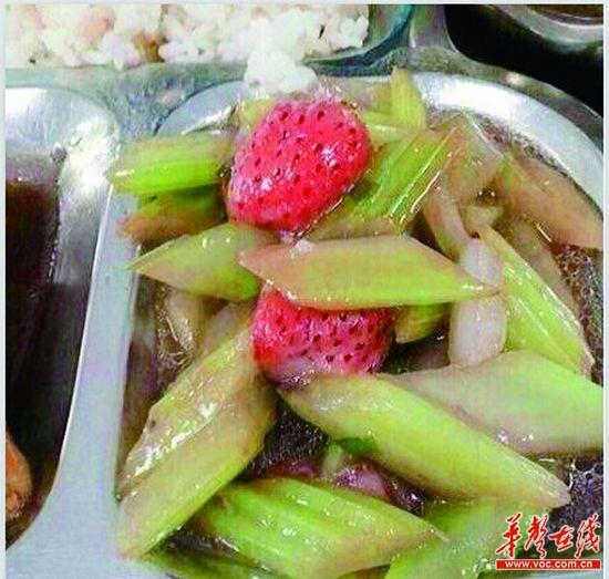 长沙网网友@笑傲四级:芹菜炒草莓,你吃过吗?湖工食堂惊现芹菜炒草莓!