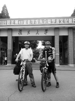 父子二人骑行至复旦大学。 (图片由郑贵贤提供)