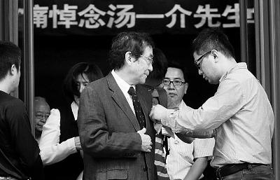 9点刚过,汤先生的夫人北大教授乐黛云在其助理的搀扶下,身穿黑色套装,面容凝重地走进灵堂。乐教授在汤先生的遗像前三鞠躬后泣不成声,一旁的工作人员连忙过去搀扶。祭拜过后,乐教授在助理的搀扶下离开了灵堂,返回家中休息。