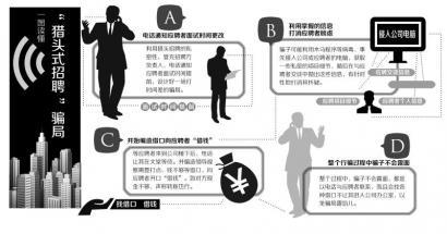 这种冒充猎头向求职者索要钱财的骗术并不稀奇。供职于某外资五星级酒店的人力资源负责人朱小姐告诉记者,几年前就有人在网上发布该酒店服务生的高薪招聘信息,并与求职者约定在酒店大堂面试。