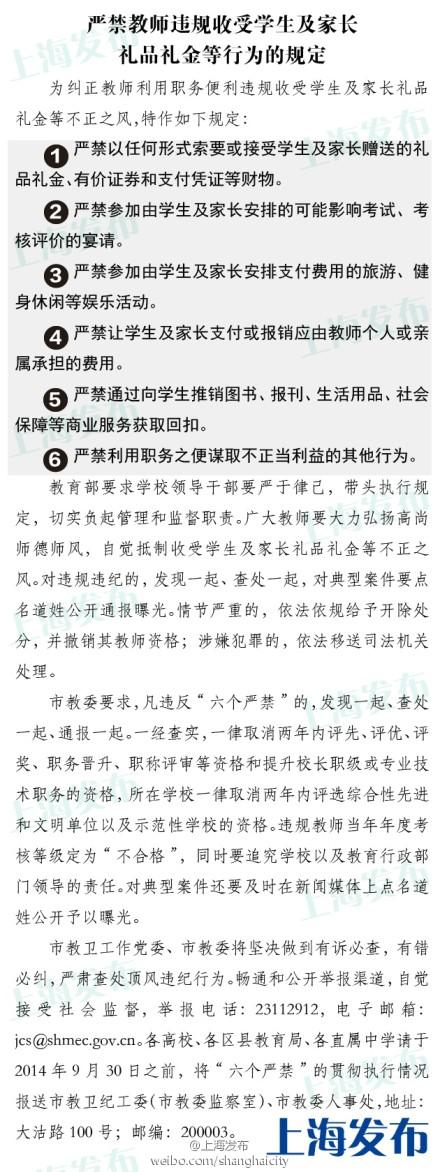 为纠正教师利用职务便利违规收取学生及家长的礼品、礼金等不正之风,上海市教委特别作出“禁止教师参加学生及家长安排的可能影响考试和评价的宴请”、“禁止参加学生家长安排的旅游”等6种规定。市教委表示,凡是违反“六个严禁”的,不仅两年内取消考核及职称评定等资格,所在学校也会被追责。同时,市教委还公布了举报邮箱:jcs@。
