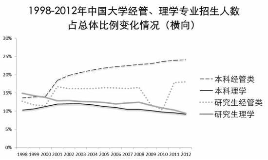 从每年经管专业、理学专业占当年招生总数比例这一横向指标来看,出现了经管专业招生比重不断扩大、理学专业不断缩小的趋势,更体现了经管热、理学冷的特点。