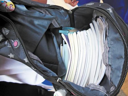 记者随机称了10个书包,一年级学生的书包平均重量为2.5公斤,二年级学生的书包平均重量约为3.3公斤,其中最重的书包达到4.5公斤。经得“最重书包”主人同意,记者翻开书包,发现里面装了四本教材、三本练习册、三本课外书、一个文具盒,还有自己买的语文辅导书、口算题卡、古筝教程,书包两边的边袋还有一盒水彩笔和一瓶没喝完的水。