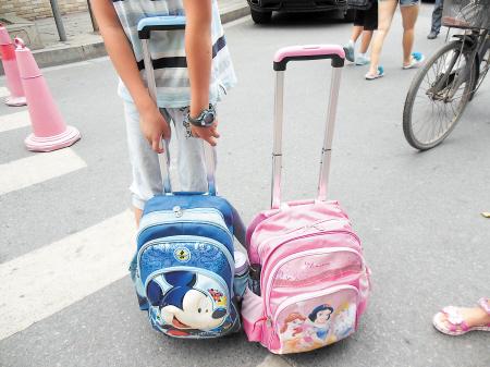16时30分左右,袁家岭附近一所小学也陆续放学。接受调查的15名学生中,三四年级的学生书包平均重量约为4.2公斤,五六年级的约为4.8公斤。在现场,记者还发现拉杆式的书包在小学生中走俏,每个班都有五六个人使用。