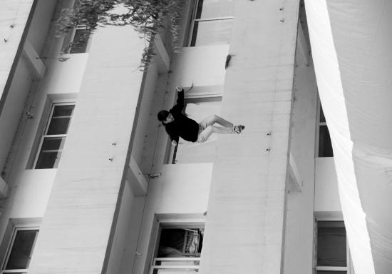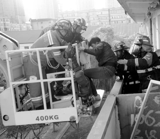 ●15时48分 40米云梯成功升到4楼阳台。那里被困的两名男生,听从消防员的安排,先后登上云梯。
