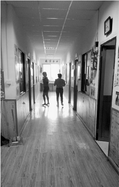 1年级教室的楼下,卷帘门拉下了一半,从外表上看,很难猜出这里是一所学校。孩子们上体育课,只能挤在一楼狭小的大厅。老师宿舍和小型工厂紧挨着高年级教室,没有消防通道。下课后,孩子们就在店铺之间的马路上玩耍。
