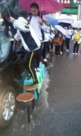 积水封住上学路 男子用板凳搭桥护送学生(图)