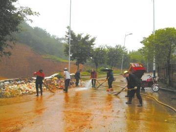 昨日上午9点,记者来到川北医学院高坪校区。现场,六七名工人正拿着水管、扫帚对校园道路进行清理。提及27日的暴雨,其中一位工人向记者讲述了当时的情景:“当时雨太大了,垃圾车没法及时将垃圾运走,因此被雨水冲到了路面上。”该工人说,昨日一大早他们就开始对路面进行清理,目前已经完成了一大半。“难度虽然比较大,我们争取赶在下班前弄完。”