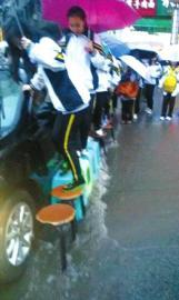 四川达州中学门前积水成河 男子冒雨搭板凳桥(图)