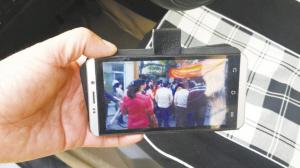 ■报料人赵先生展示他用手机录的拥堵视频,家长狂挤一个小门。