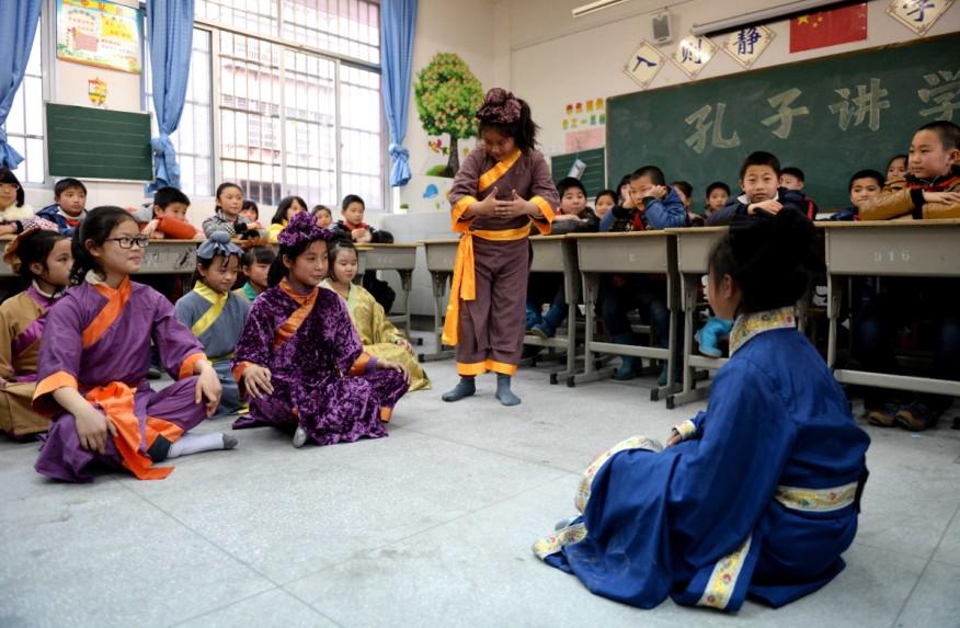 在安徽省合肥市庐阳区的南国花园小学,校长娄平介绍,学校已将国学教育纳入一整套课程体系之中,“古礼新韵”版块试图通过礼仪教学和礼仪操,让仪式性的东西潜移默化于孩子的心中;“阅读雅诵,风骨铿锵”版块则通过对古文诵读和博文妙解强化学生对经典的感悟。