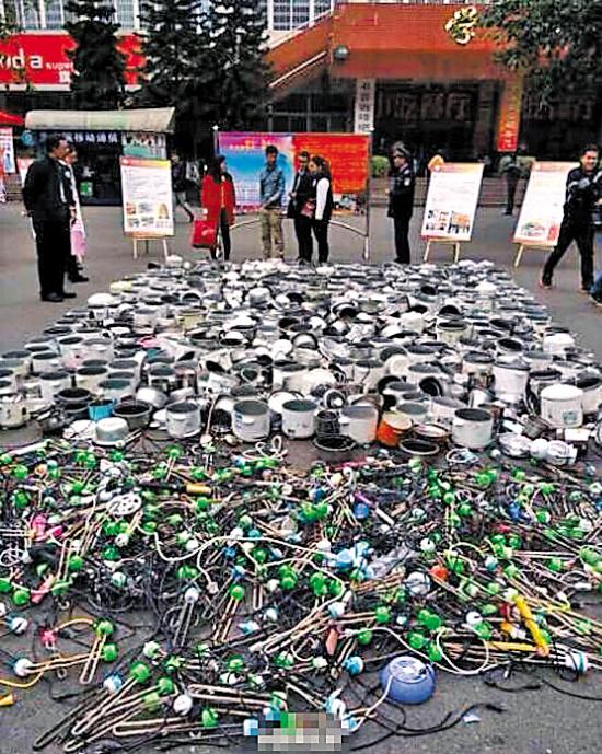 昨日,新浪微博@直播成都发布了一组照片,西南民族大学将近期查寝的战利品“游街示众”,包括电饭煲和热得快等电器。图片中,电饭煲和热得快铺满校园广场,有网友表示:太惨烈了。