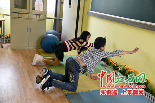 课后,学校的资源老师张颖带着小游,来到办公楼二层的资源教室,进行康复指导。这是一间面积不到30平方米的教室,里面布置着黑板、人工草坪、海绵垫子和教具等。“这儿原来是音乐教室,去年3月,学校启动‘随班就读’后,就用纱帘将教室一分为二,其中一半作为专门指导残障学生的资源教室。”张颖告诉记者,每周三下午,小游都会在这里上一堂康复课,由自己一对一辅导。“因为他四肢不是那么协调,所以我们设计了一些物理康复环节,包括关节运动、肌肉力量训练等,另外,还有额外的教学辅导。”