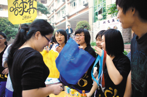 学校新开了射击场?别误会,这是高一一班男生卢布布开的档口——“布布射击场”。“以前感觉政治课的价值规律很抽象,现在终于能理解。”卢布布说,“如商品多竞争大,卖的商品怎样才能吸引顾客?一要价格方面比学校和外面地摊都要低,又要卖别人不卖的东西。”其中一名组员是学校公关部部长,由于有一定的和企业打交道的经验,懂得怎样别出心裁地“打响招牌”。最后他们借鉴了广场的娱乐元素,让射击中奖者可获得食模玩具奖励,同时布布还戴上兔耳朵举牌揽客,这样招揽了不少顾客。“现在终于体会到父母‘揾食’的艰辛了,”卢布布说,现时学业繁重,挤出时间进货,晚上11、12点才回家,光挑货也挑上一小时,而且内部在进货种类上还存在分歧。后来,布布还是让十余个组员每人负责不同的细项,他们的“企业”才顺利建起,“要办好一家企业,团队协作非常重要!”最后射击场销售额700元,盈利200多元,布布表示,更重要的是通过这次活动,体会到和社会接轨的感觉。