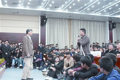 据了解,这场见面会并未对外界媒体公开,仅在校园BBS上发了个消息。晚7时30分,记者作为旁观者坐到该校经济学院报告厅内,无意窥见了一场有意思的学生们所称的“培根叔见面会”。