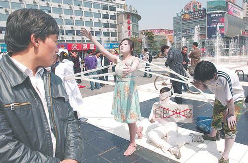河南大学30多名学生近日从开封市赶到郑州市二七广场,身涂彩绘,用行为艺术形式创造出5个主题,提醒大家节省资源减少污染。这组行为艺术展现了“白色污染”给地球造成的危害和给人们生活带来的灾难。 张翼飞摄