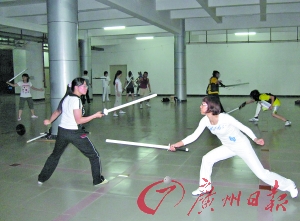 本报讯 (记者卢迎新 实习生 李婷婷摄影报道)暨南大学有个短兵协会,每周的周二、周四、周日晚上,会员们都集中练习。这种对抗性强的运动受到在校博士硕士们的热捧,尤其吸引了一些平日里斯文纤弱的女博士加入,她们表示:“就算被打也很爽快,认为是一种时尚。”