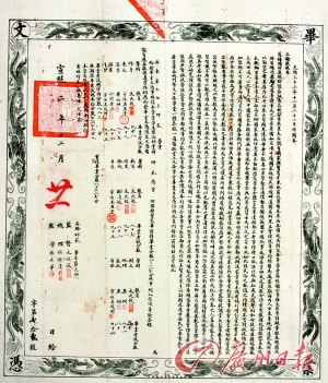 一张99年前广东官立女子师范学堂毕业文凭(证书),近日由美籍华人郭宝英先生捐献给广州博物馆,成为目前唯一见到的广东官立女子师范学堂毕业文凭珍贵物件。这张中国废科举办学堂后颁发的最早文凭,是考证广州得风气之先,近代广东妇女解放的重要物证。昨天,该文凭物件已被正式上架广州博物馆80周年捐献文物特展供市民参观。
