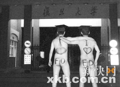 昨日,一条名为《复旦学生裸奔庆祝毕业》的图文帖,火遍猫扑、天涯、华声、网易等论坛。在贴出的图片中,两名男生头戴学士帽,裸体在复旦校园内奔走,并在学校大门、校训等多个地方留影。在网帖中,发帖者并未对两名男生作介绍,但从其中一名男生在复旦的“恒隆物理楼”留影来看,网友们认为这两名男生应该是复旦物理系的毕业生。