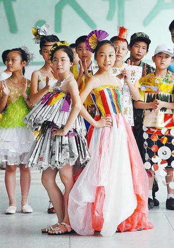 6月30日,江西九江市双峰小学学生展示他们用报纸和塑料桌布制作的“时装”,以“环保秀”的方式来纪念小学生涯,告别母校。 新华社记者 章武摄