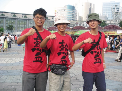三件大红的T恤,印着一式的“热血”两字,浓墨的字符如同三团跳动的黑炎,吸引了无数人的眼球。昨天,阿杰、栋栋和峰总三个90后的大男孩在天一广场上狠狠地秀了一把。