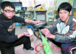 本报讯 (记者李立志 通讯员南宣)10来元钱的门铃还有什么其他用途?南沙黄阁成人学校梁俊斌和张启华手里拿着一个自行车的头篮,一个自行车的座包,一个常见的家用门铃,这就是“自行车防盗报警器”。他们经过三个多月的时间研制,发明了这个东西。在第25届广州市青少年科技创新大赛上,南沙区黄阁成人文化技术学校两个农村的孩子发明创造作品《自行车防盗报警器》获得了金奖。