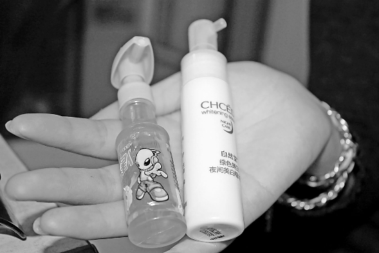 而记者彻底被雷翻,是在看到许多小学生拿着一瓶瓶像化妆水的东西往嘴里喷,还津津有味地说好吃。据说这也是时下流行的零食之一——一种名叫“林老弟”的外星人菠萝果汁,按压上面的喷头,果汁就直接喷出来。一些顽皮的小男生还一边吃,一边用这个果汁瓶充当水枪互相激战。