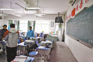 在记者的要求下,同学打开了灯。黑板左上角用粉笔写有当天课程表,其中第一节就是数学课。唐佑国同学称,马老师是今年才接的这个班,他刚刚教完了一个完整的高中三年,正好下来接高一的2个班(18、19班)的课。