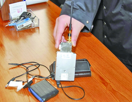 民警发现,该装备类似香烟盒大小,兼具信号发射与接收功能,总共分三部分:信号发射器、微型针孔摄像头、无线耳机。微型针孔摄像头用一根数据线连接后,藏在胸前的纽扣中,发射器挂在腰间,耳机塞在耳朵里。